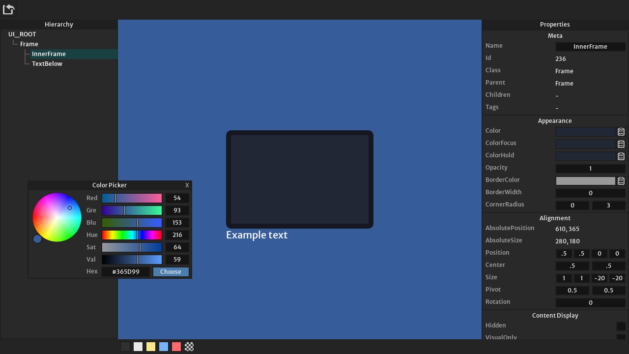 For the UI system I also briefly worked on a visual editor, but dropped the project after realizing its upkeep would be too time-consuming.